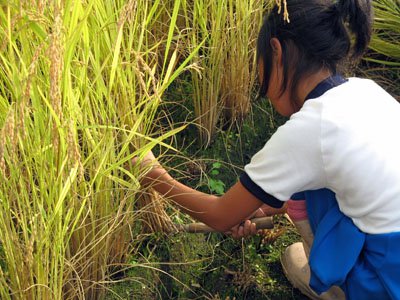 コシヒカリです。たわわに実った稲を元気いっぱいに刈り取る伊佐沢小学校