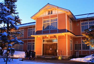 日に降った真新しい雪に囲まれてオレンジ色の灯りに照らされた校