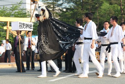 奉納される庭獅子は、下りの舞は速めにまわり、上りの舞は社殿に