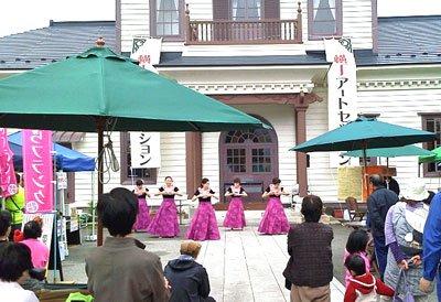 建物正面では小桜館で練習をしているカフラオハワイの皆さんによるフ