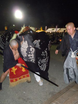 例大祭での昼祭では獅子は警護のわずかな隙をついて里に