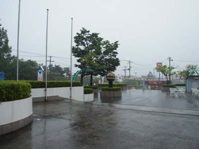 太陽の広場に出てみたら、雨がシャワーのように床を叩きつけていました。