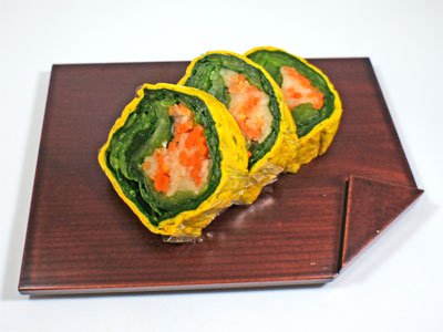 青菜で大根と人参を巻き、その外側を黄菊で丁寧に巻きあげた漬物!!