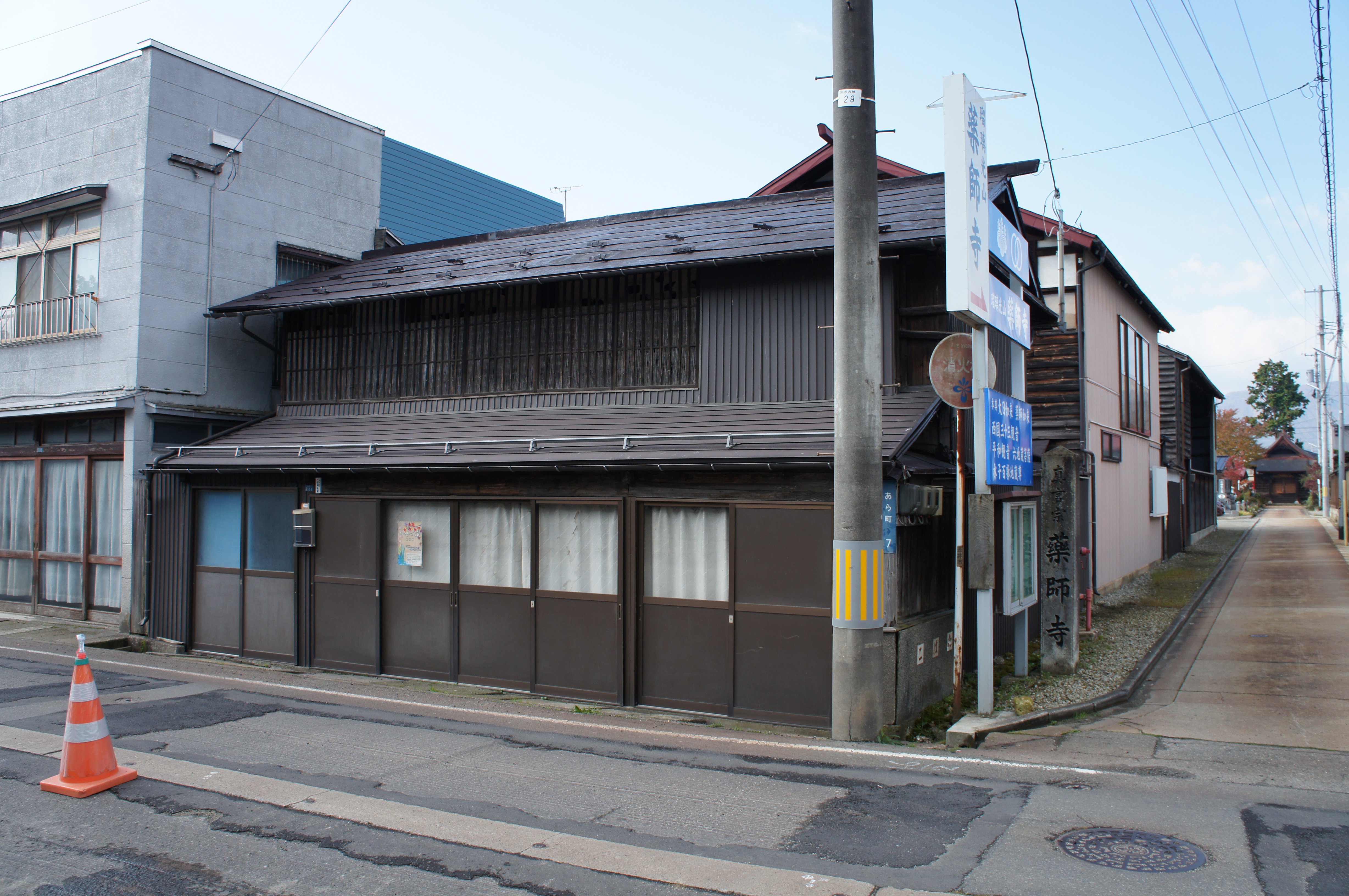 間取りは1階が店舗、2階が8畳と6畳の二部屋があります。1階は壁を板壁、天井を根太(ねだ)天井とし、下屋を下屋天井としています。東側の下屋部分から出入りし、床は現在床板を張っておらず土間となっていますが、柱にかつての床板の痕跡が残っており、土間から11寸の高さの位置に床板が張られていたことがわかります。建物の中央東側よりの4本の柱には、柱の北面と南面の両側に縦に長い溝が見られました。これはかつて上げ戸であった痕跡で、当地域では上げ下げする板戸のことを「シトミ」と呼んでいます。下屋部分に板戸をしまう空間が確保されており、かつては3枚の板戸を上げ下げするシトミ立ての表構えであったことを表しています。また、昭和30年代までは店舗の南面から北へ1間のところは間仕切りがあり、それより南側は外部で、水路の水はかつて店舗の下ではなく外部を流れていました。西側の梁(はり)や柱には臍穴(ほぞ)や貫(ぬき)跡がいくつか見られますが、これはかつて使用していた商品棚の柱跡で、棚の奥行きは約1尺5寸です。