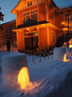 ながい雪灯り回廊まつりイベントのひとつ、「長井小学校第一校舎」ライトアップ