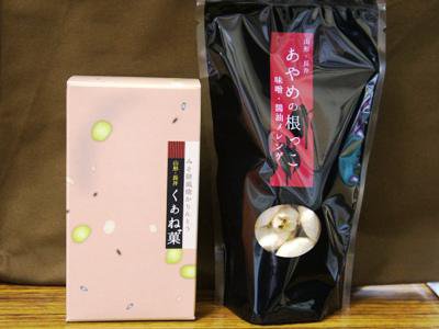 その名も「くぁね菓゛」(置賜弁で食べてみない?の意)と「あやめの根っこ」。