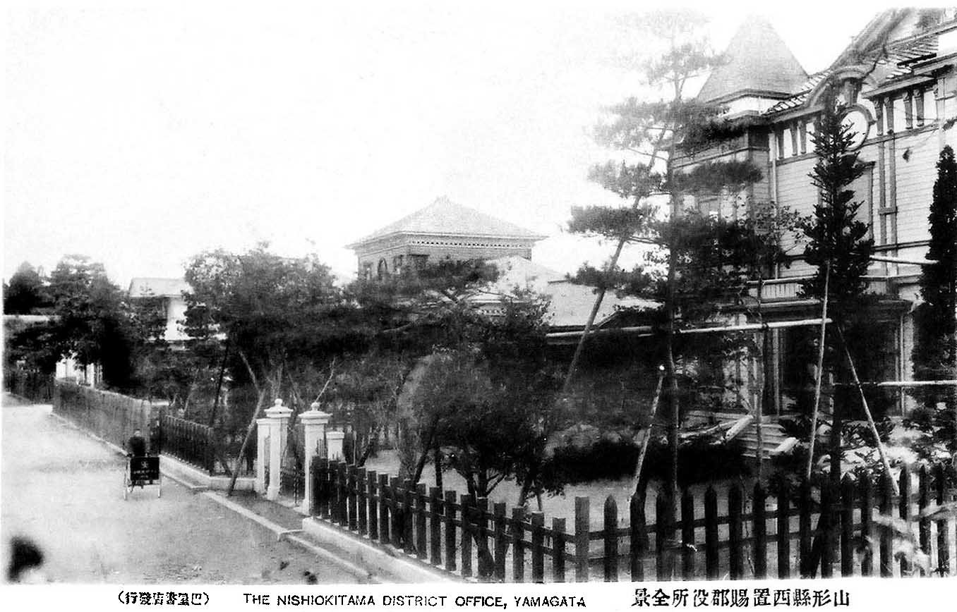 西置賜郡会議事堂、特別会計で。設計費は150円。初代郡会議事堂の売却金も充てる。売却先は「置賜織物同業組合」に、6月に入居し、初代は模様替えと増築がなされた。大正12年の郡制廃止まで事務所として活用、以降組合は、旧西置賜郡立図書館・物産陳列館を譲り受け移転。初代郡会議事堂は、荒砥繭市場の建物として買い取られた。その場所には昭和4年、長井税務署の建物が新築された 当時の絵葉書