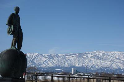 長井橋の両端には、長井市出身の彫刻家長沼孝三氏の作品、「昔」と