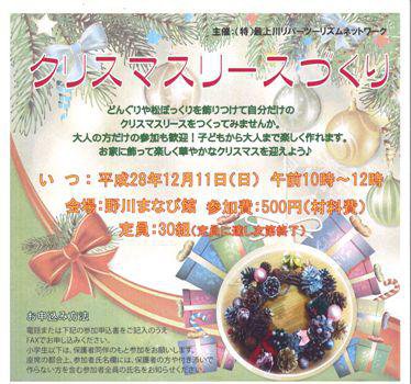 野川まなび館では、今週末の12月11日(日)に「クリスマスリースづくり」を開催します。