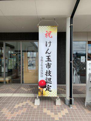 「道の駅 川のみなと長井」の正面玄関前にタペストリーが掲げられ、